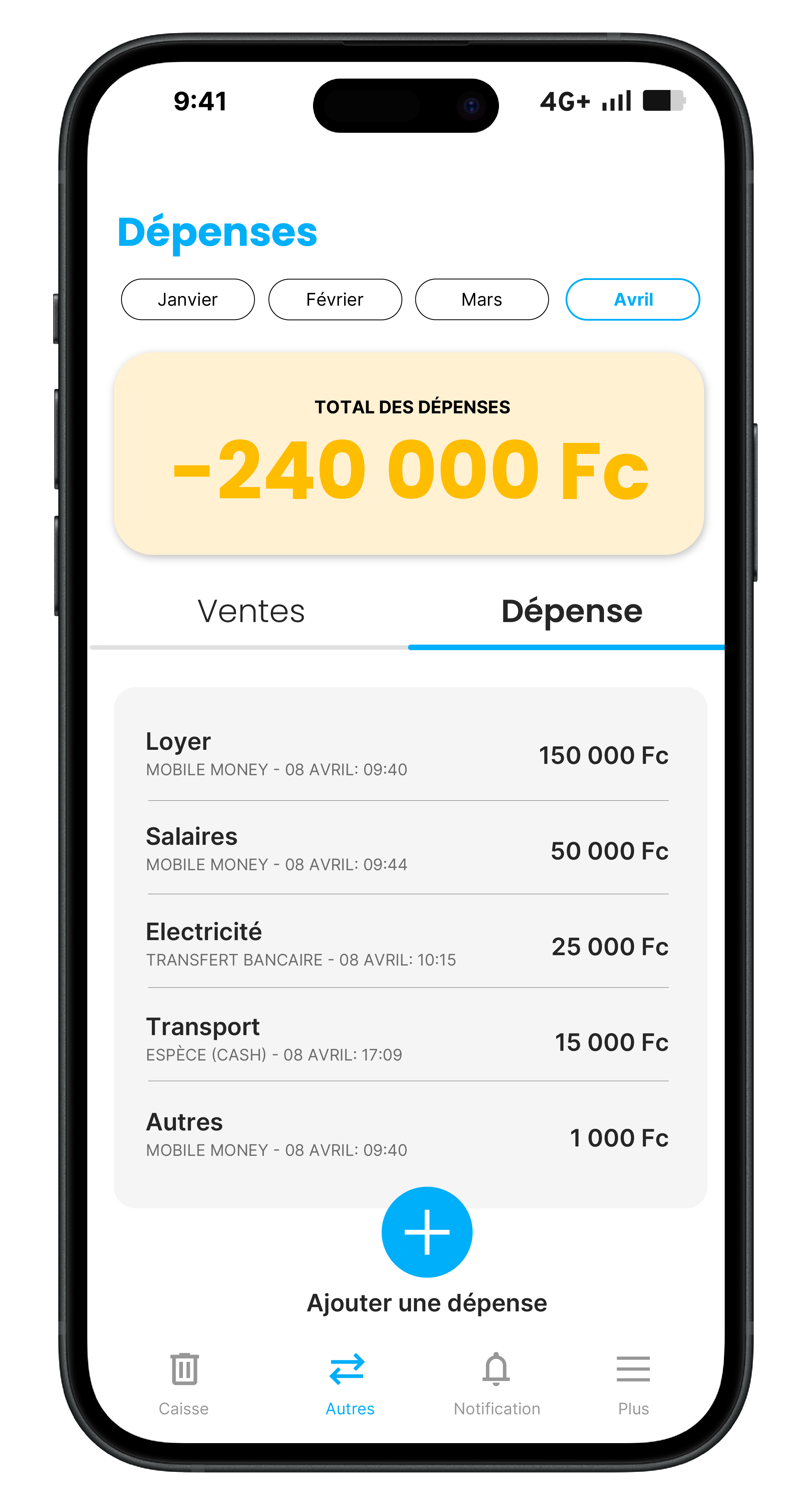 Ventes, dépenses, dettes, tout est sauvegardé automatiquement.